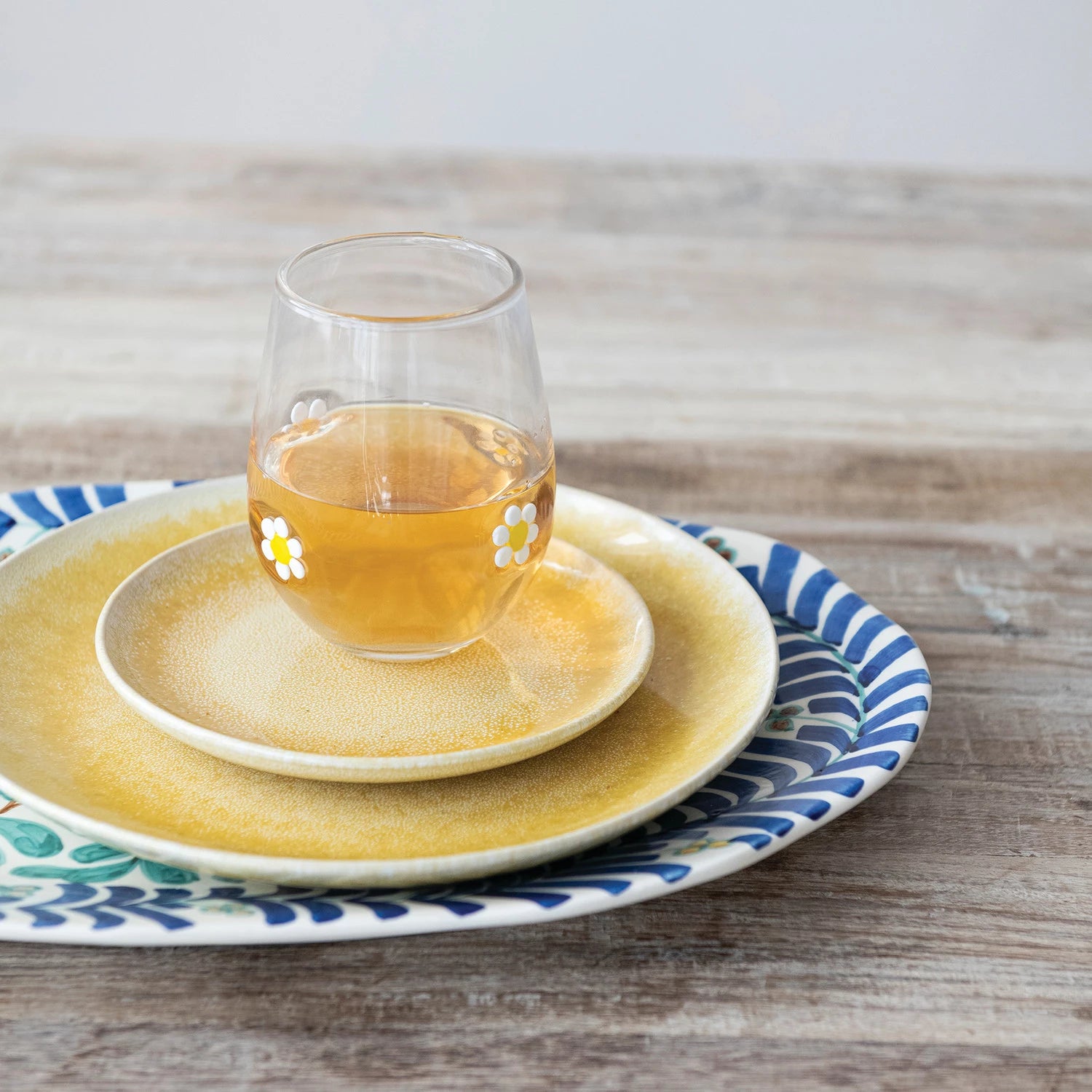 A 16 oz. drinking glass with embedded white and yellow daisies.