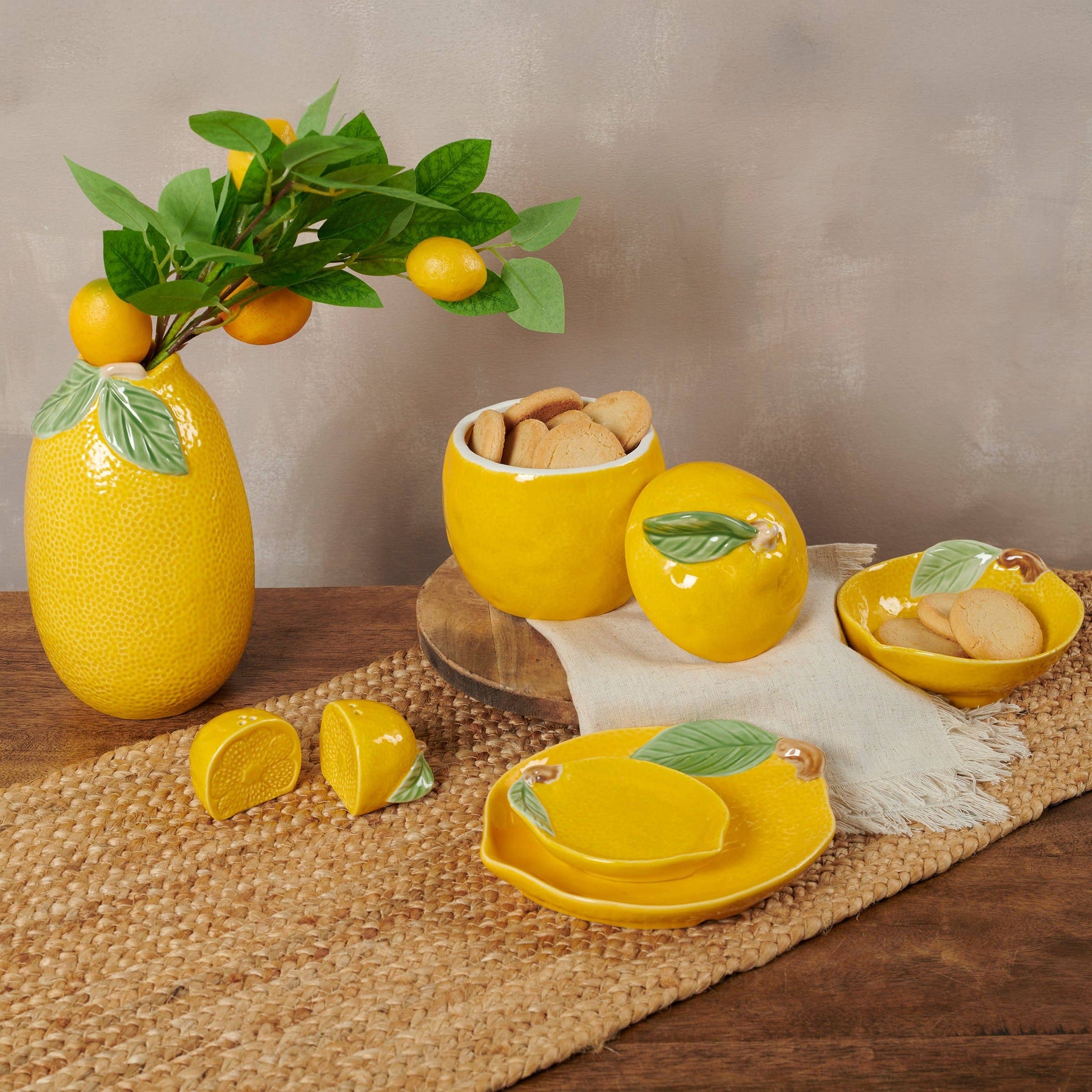 A small stoneware plate from our Garden Collection displaying a lemon inspired design with a textured glaze finish and sculpted leaf details to resemble the features of a lemon. Our small Lemon plate is conveniently microwave, oven, dishwasher, and food safe for easy use. A piece of fun dishware perfect for lemon-themed tablescapes.