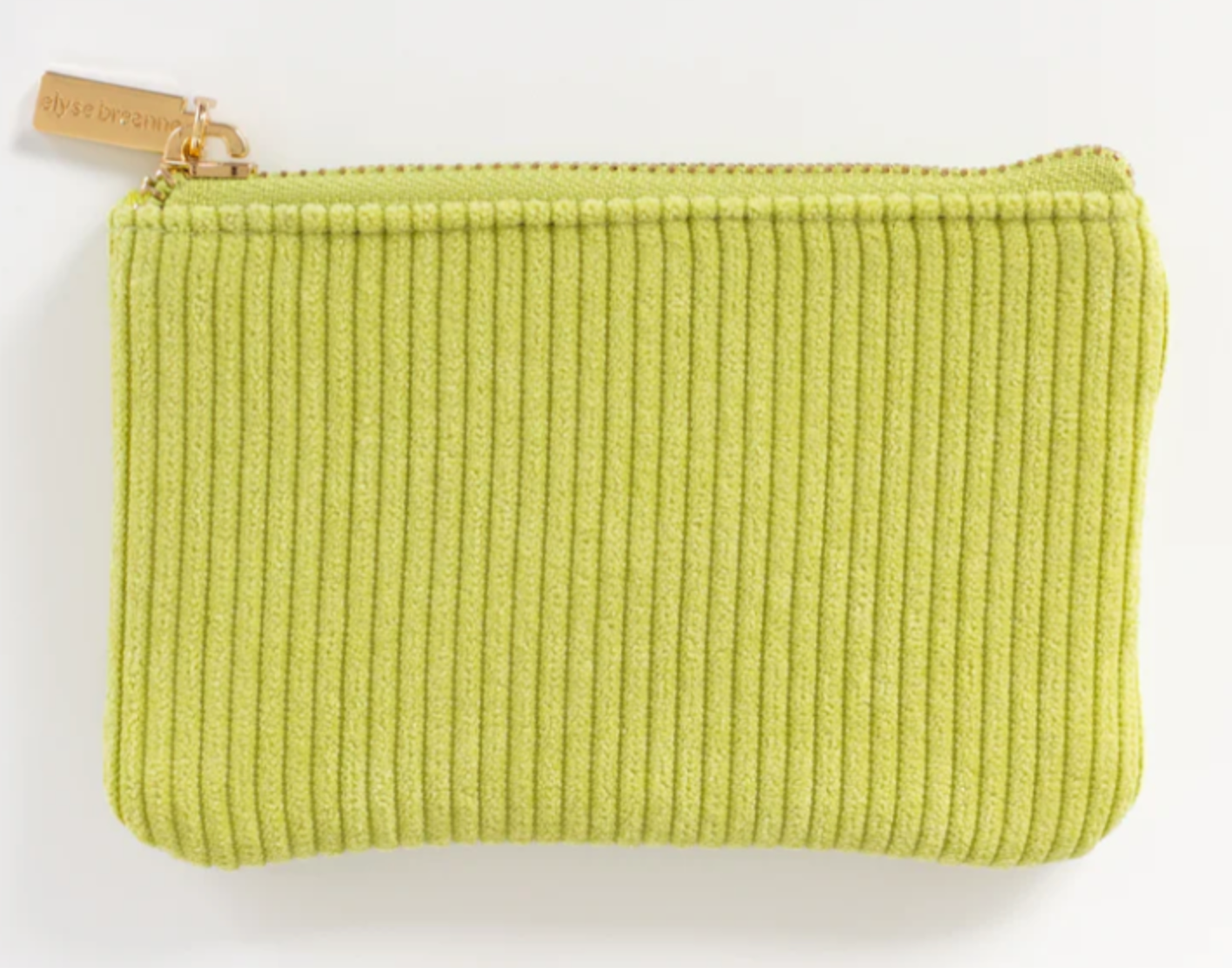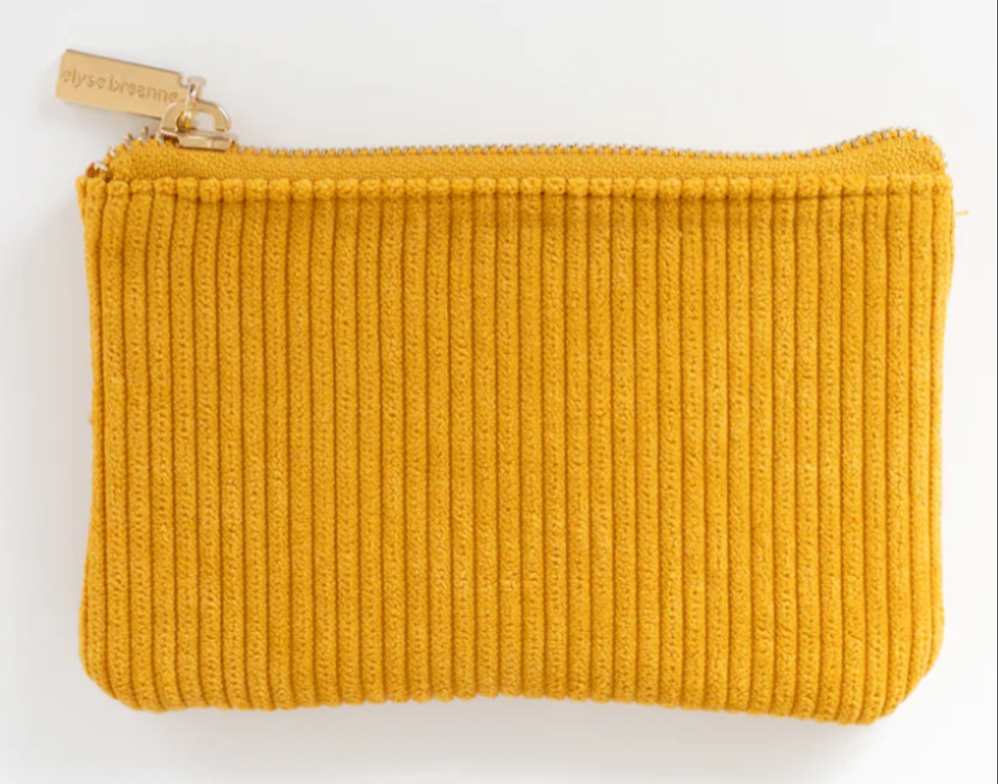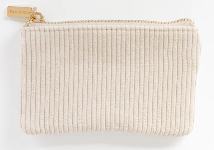 Corduroy Coin Pouch with gold accent zipper closure. Made from cotton and polyester.