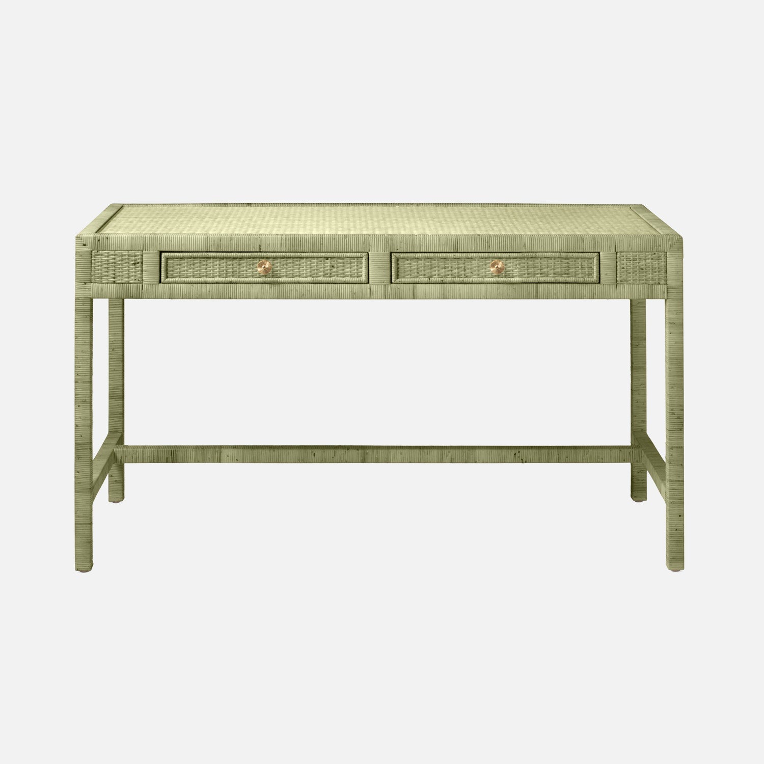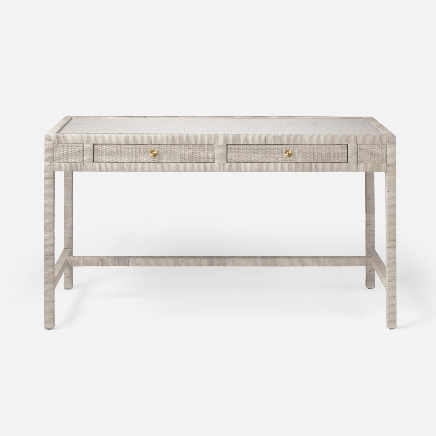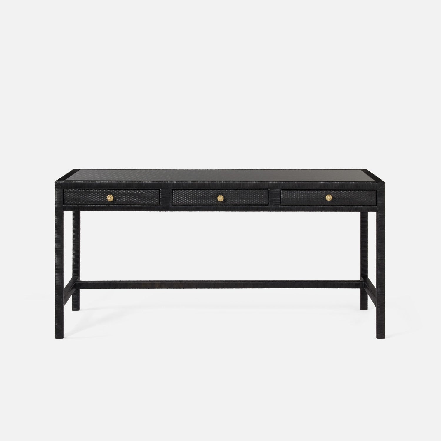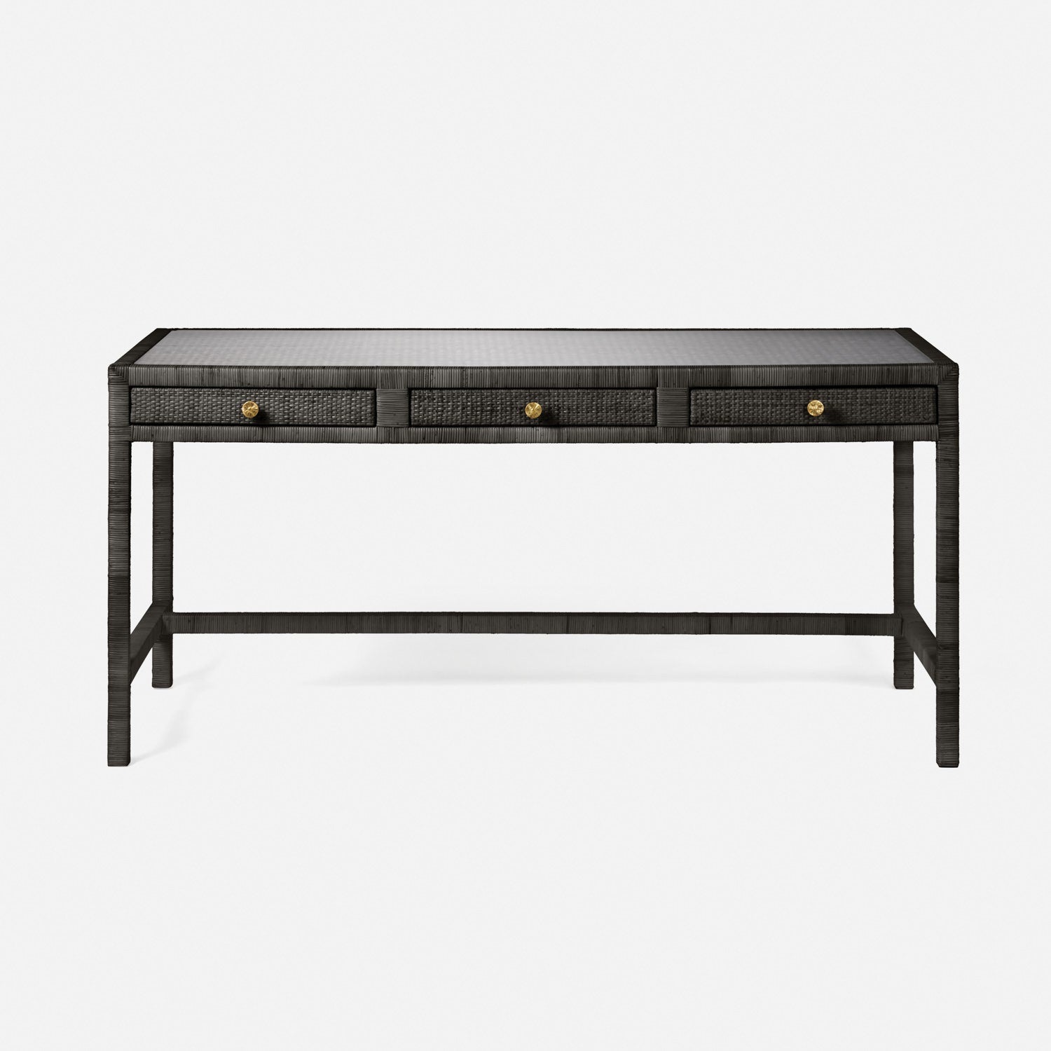 A tightly wrapped, natural peeled rattan frame, with slender legs reinforced by a box stretcher, supports an expansive, densely woven basket weave top. A piece of glass protects the material against the spills and stains of daily life. Soft-close front drawers with flower-patterned gold knobs, finished with a dark gray stained wood interior, offer storage for office necessities.