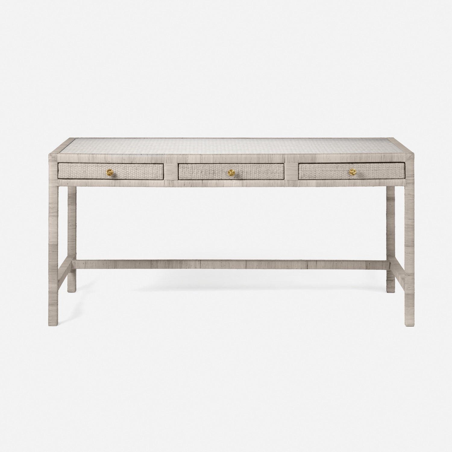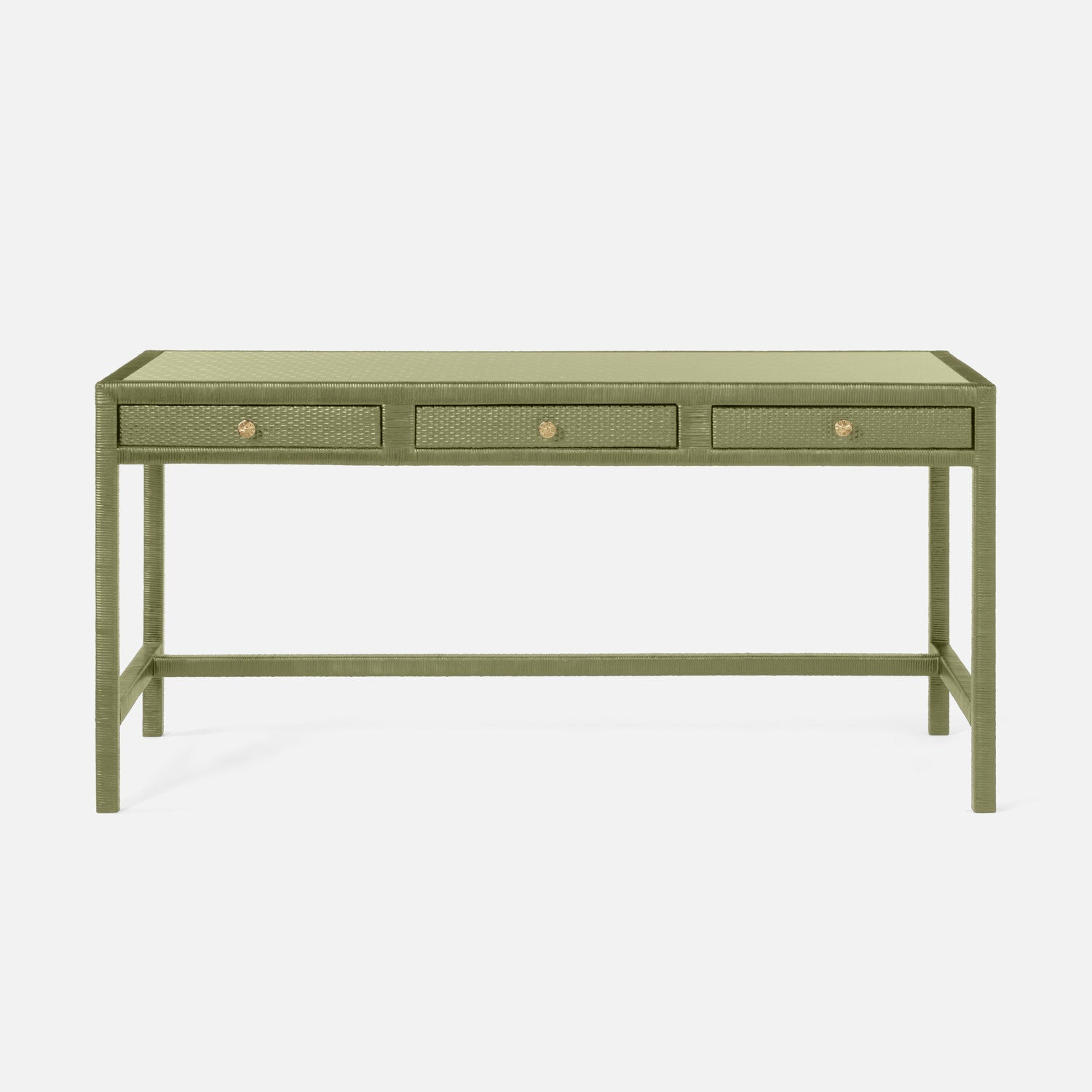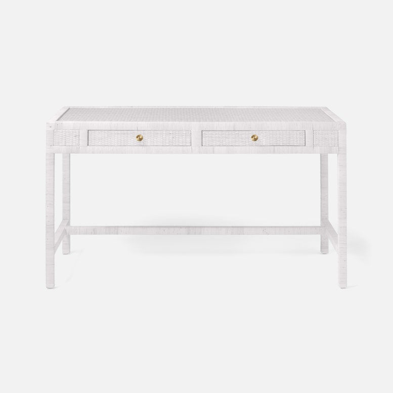 A tightly wrapped, natural peeled rattan frame, with slender legs reinforced by a box stretcher, supports an expansive, densely woven basket weave top. A piece of glass protects the material against the spills and stains of daily life. Soft-close front drawers with flower-patterned gold knobs, finished with a dark gray stained wood interior, offer storage for office necessities.