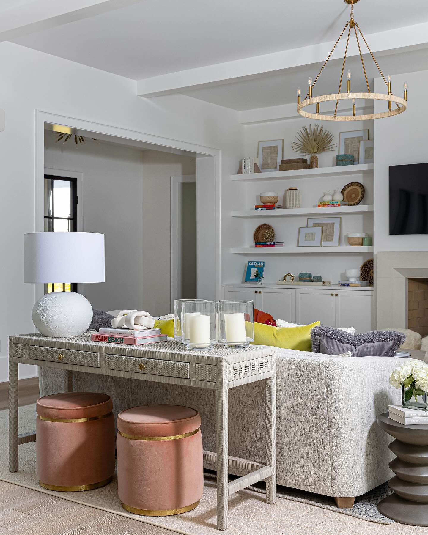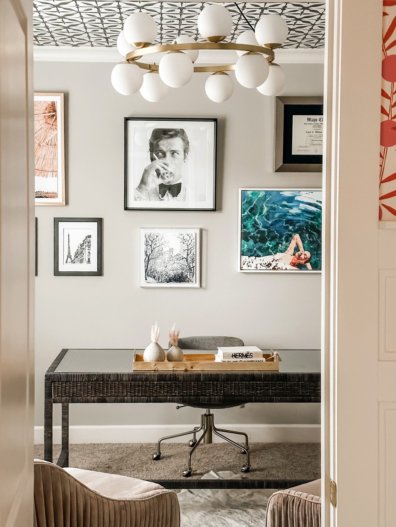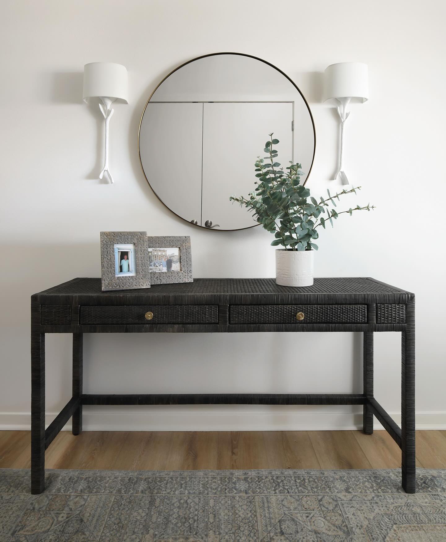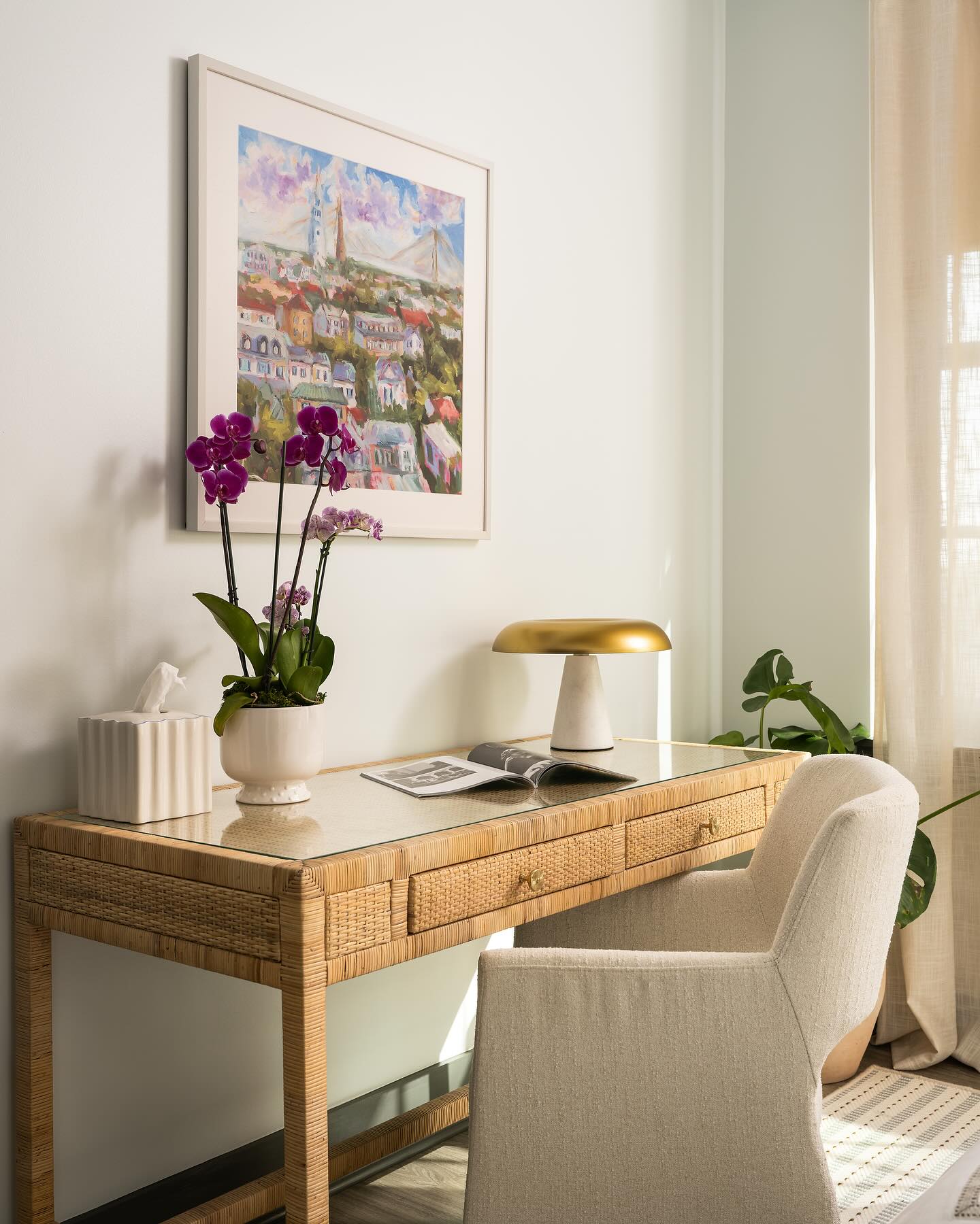 A tightly wrapped, natural peeled rattan frame, with slender legs reinforced by a box stretcher, supports an expansive, densely woven basket weave top. A piece of glass protects the material against the spills and stains of daily life. Soft-close front drawers with flower-patterned gold knobs, finished with a dark gray stained wood interior, offer storage for office necessities.