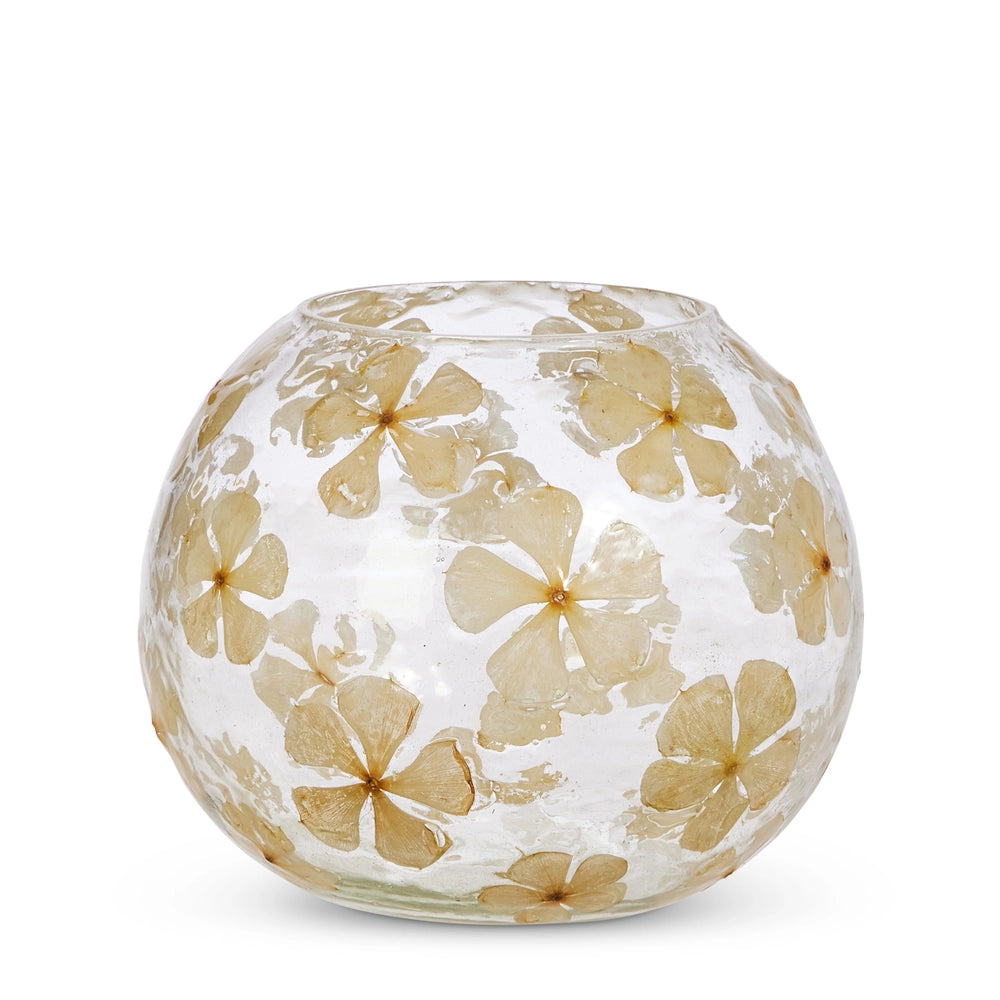 A delicate celebration of nature, this dried floral glass vase features preserved blossoms artfully encased within clear glass. Soft, neutral petals create a subtle botanical pattern, offering organic texture and understated romance. Its rounded silhouette adds gentle volume, making it a beautiful statement on a console, dining table, or styled shelf. Whether displayed alone or filled with fresh stems. A timeless piece that brings warmth and quiet elegance to any space. Holds up to 3" pillar candle*