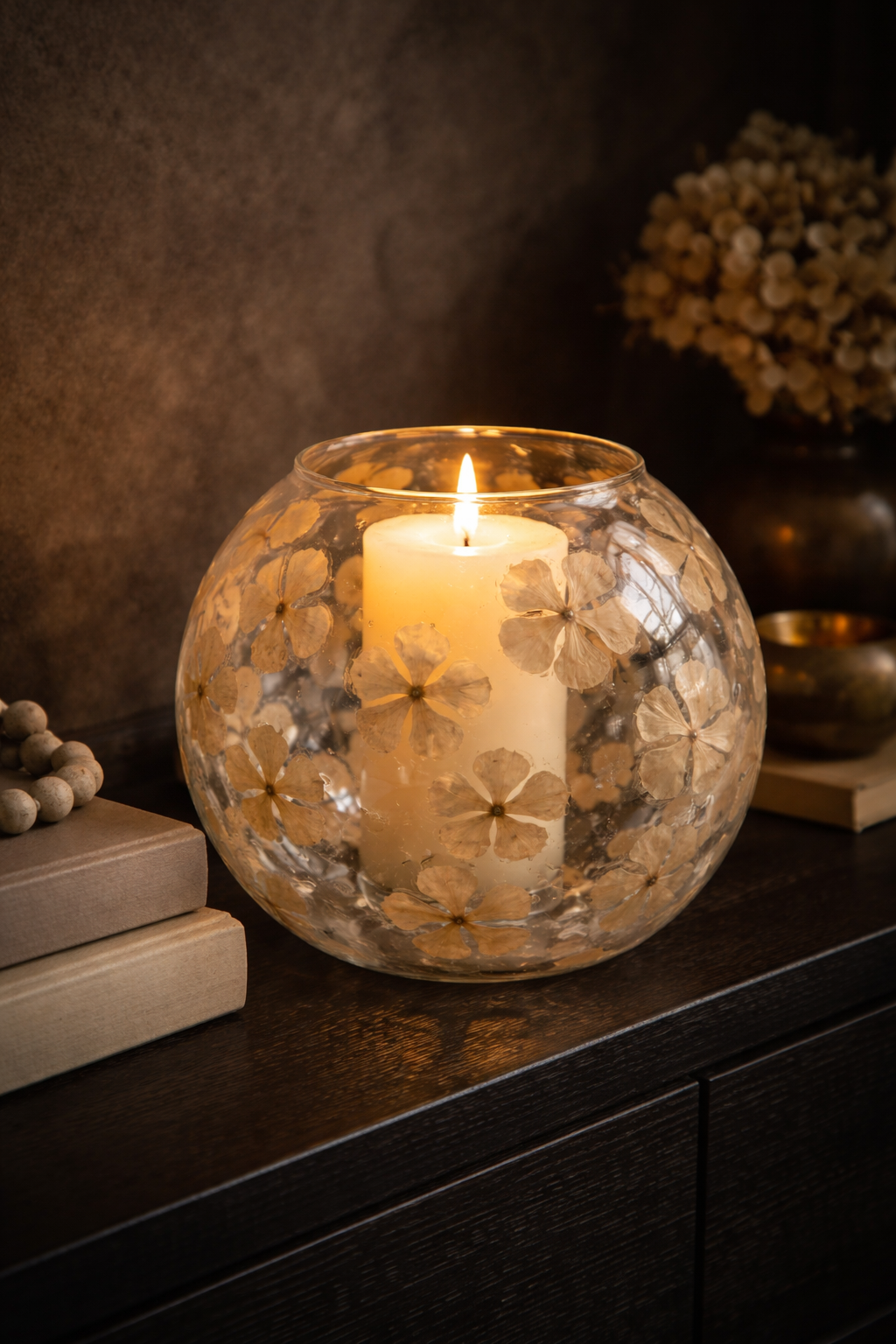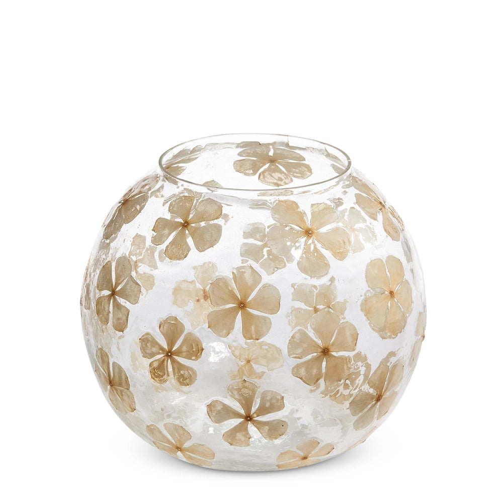 A delicate celebration of nature, this dried floral glass vase features preserved blossoms artfully encased within clear glass. Soft, neutral petals create a subtle botanical pattern, offering organic texture and understated romance. Its rounded silhouette adds gentle volume, making it a beautiful statement on a console, dining table, or styled shelf. Whether displayed alone or filled with fresh stems. A timeless piece that brings warmth and quiet elegance to any space. Holds up to 4" pillar candle*