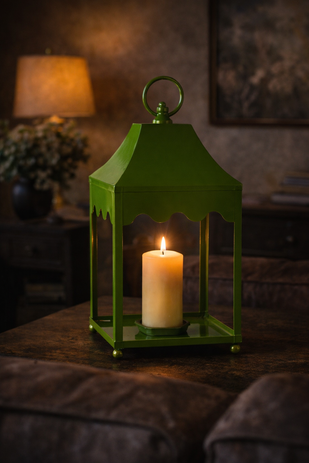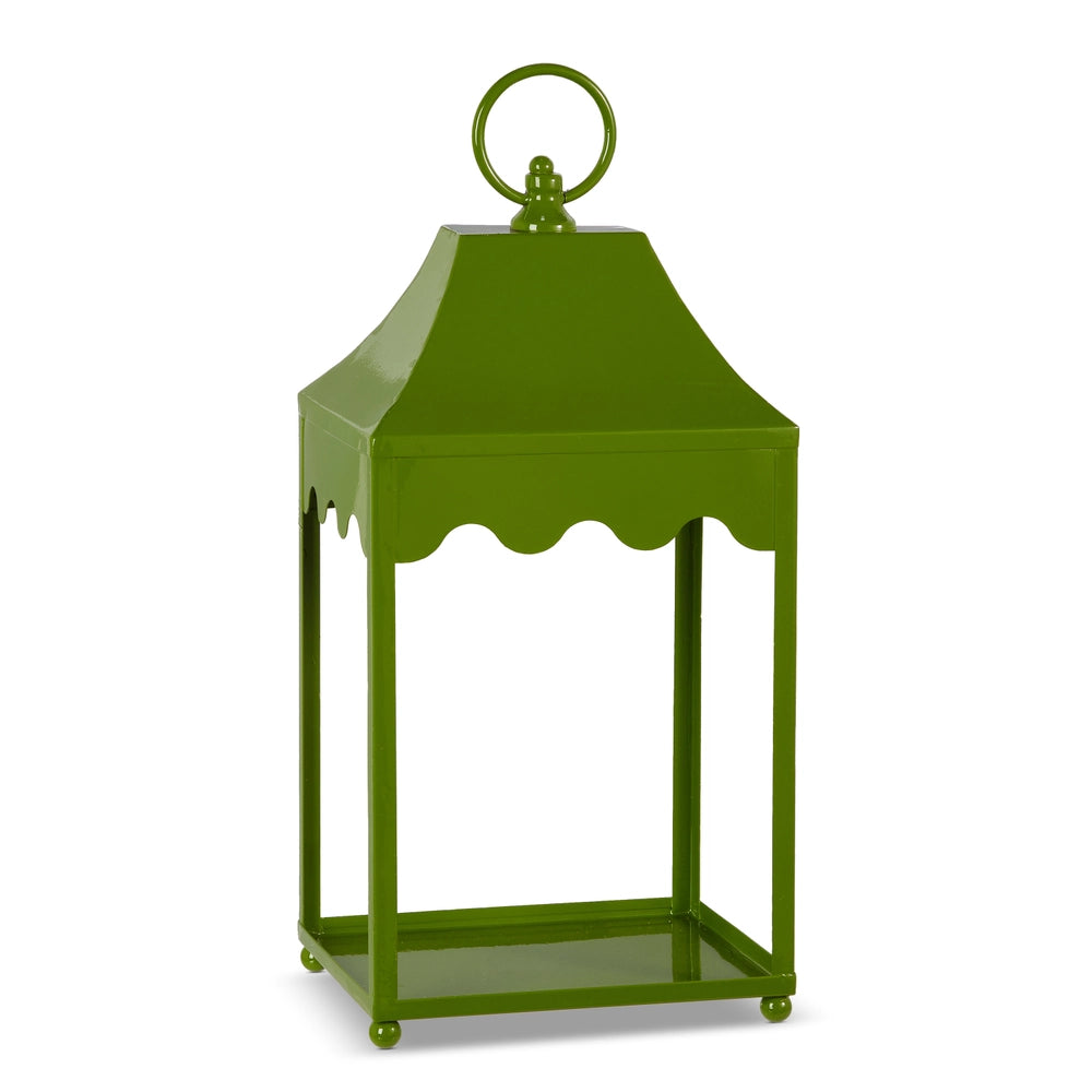 Elevate your interiors with this statement-making green iron lantern, finished in a rich, high-gloss hue that brings depth and character to any space. Its classic silhouette, complete with scalloped detailing and a sculptural ring top. Perfect for styling with a pillar candle, this lantern casts a warm, inviting glow and adds a sophisticated pop of color to entryways, living rooms, or covered patios.