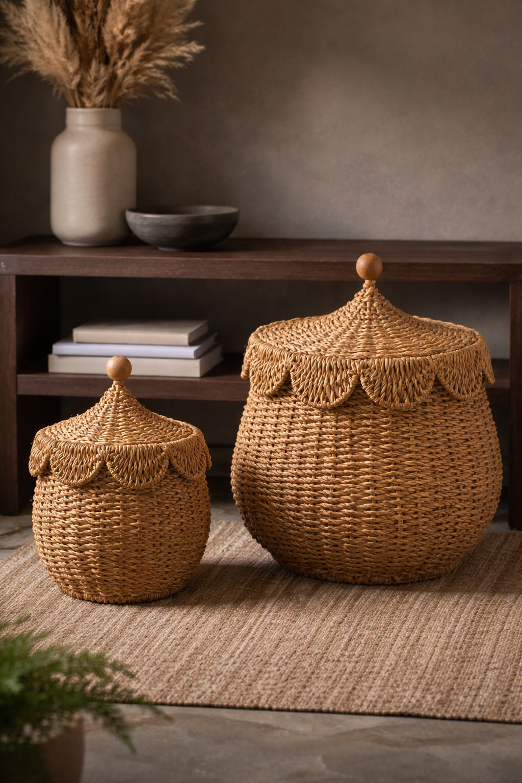 Handwoven from natural bankuan, this set of two baskets brings texture, warmth, and functional beauty to any space. Each basket features a softly rounded silhouette with a sculptural lid and subtle scalloped detail, making them as decorative as they are practical. The organic weave and natural tone create an effortless, collected look—perfect for storing everyday essentials while adding visual interest to shelves, consoles, or open floor spaces. Set of 2 baskets and 2 lids.