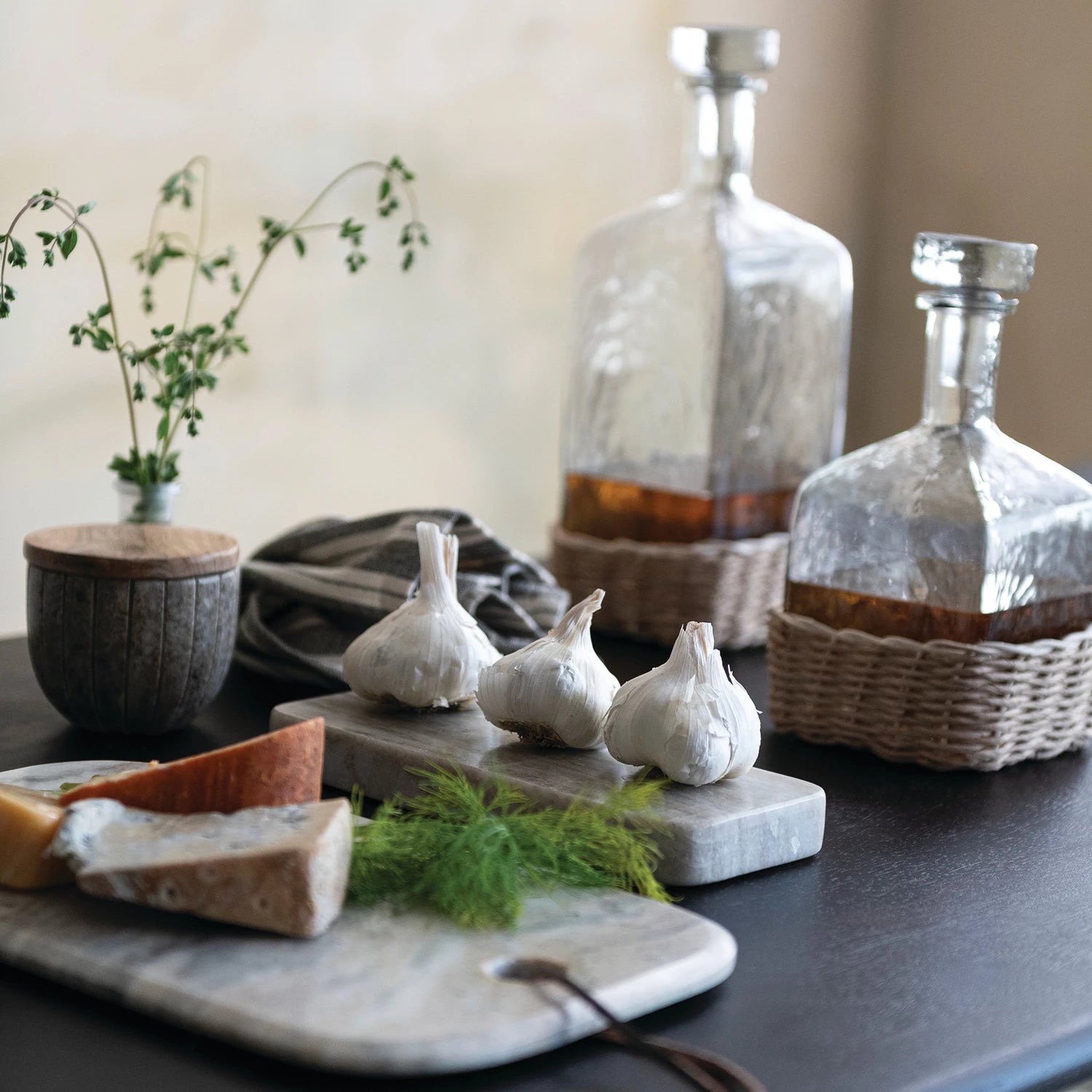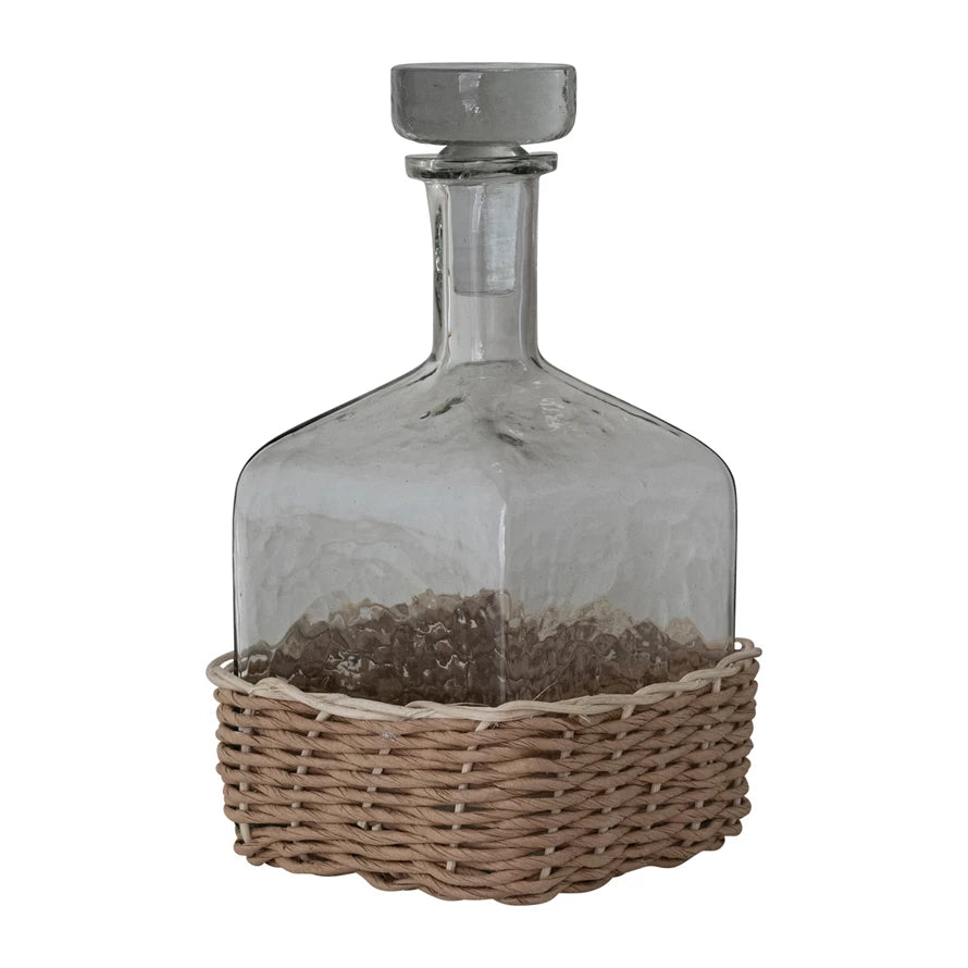 A refined blend of glass and handwoven rattan, this sculptural decanter balances modern simplicity with organic warmth. Finished with a matching glass stopper, it’s perfect for serving spirits or styling on a bar cart. An effortless accent that feels both functional and beautifully collected.