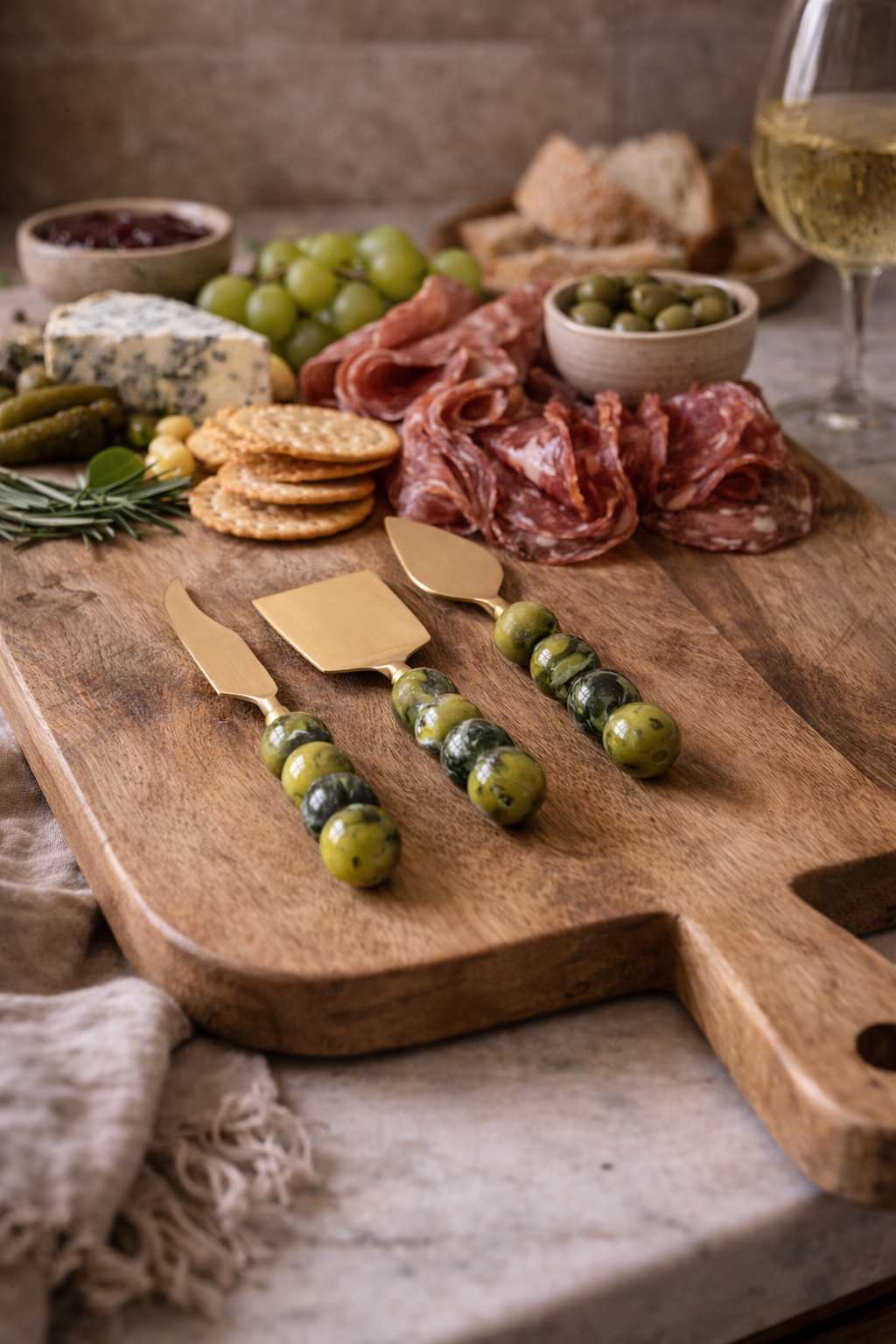 Elevated and artful, this set of three charcuterie knives pairs sleek stainless steel blades with sculptural marbled resin handles in rich green tones. Each handle features subtle variation, making every piece beautifully unique. Designed for effortless entertaining, the trio includes shapes ideal for slicing, spreading, and serving a variety of cheeses. Both functional and striking, they bring a refined pop of color and texture to any gathering.