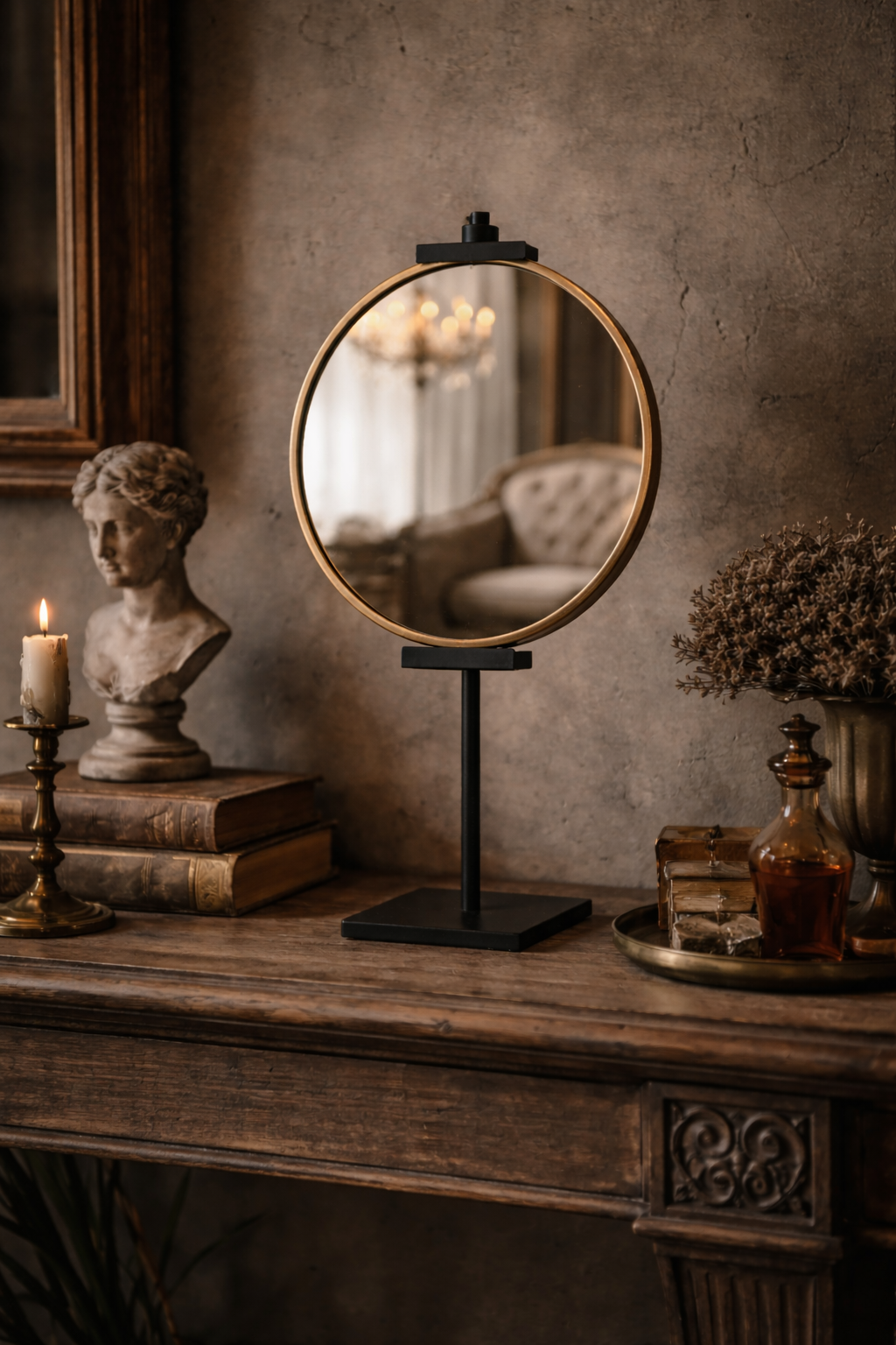 An understated yet sculptural piece, this adjustable display stand brings a quiet Parisian elegance to any interior. Crafted with a sleek matte black metal base, its clean lines and architectural form create a striking contrast against softer, organic décor. Designed to frame mirrors, artwork, or decorative panels with intention, the adjustable brackets allow for effortless styling while maintaining a refined silhouette.