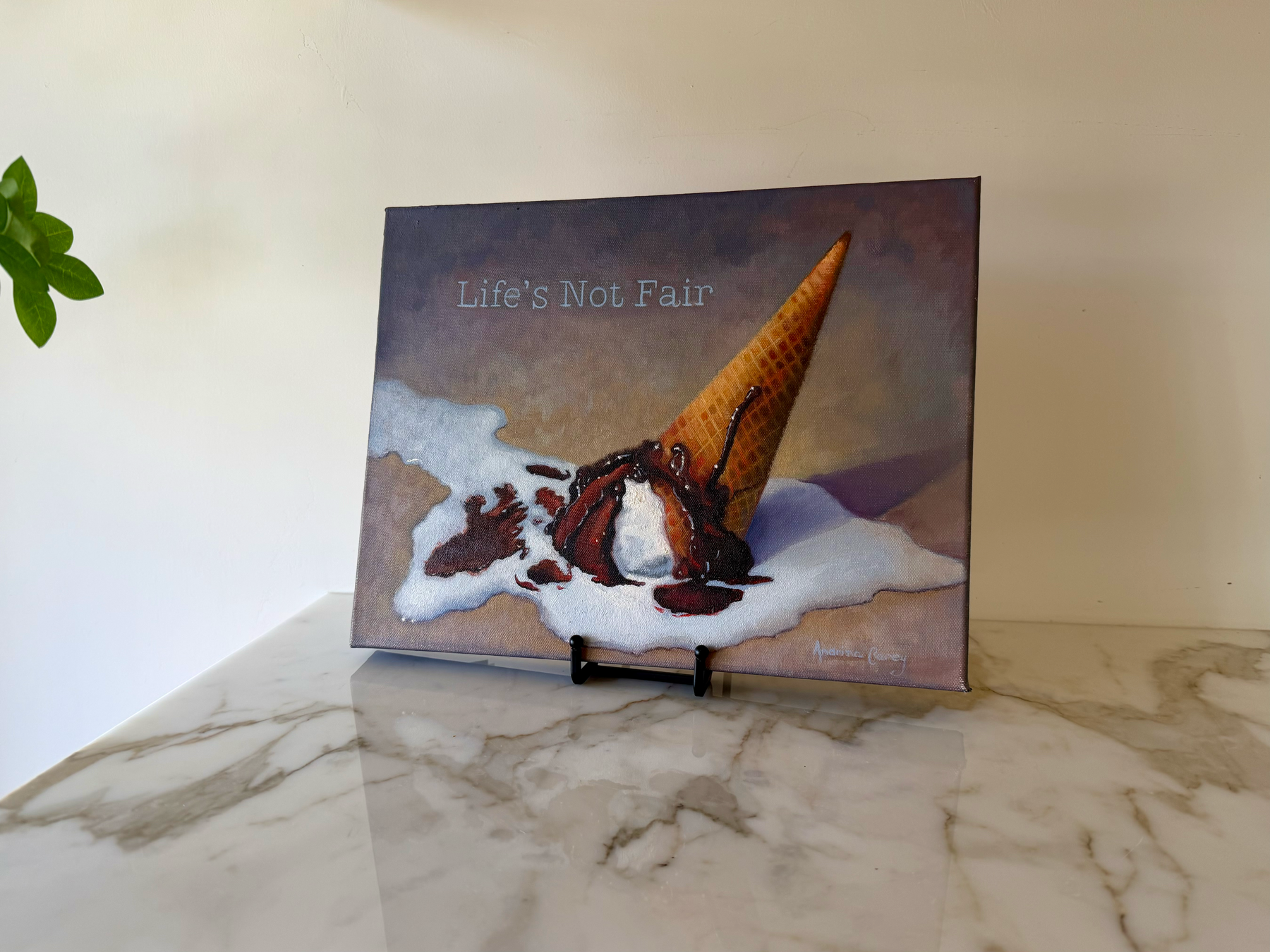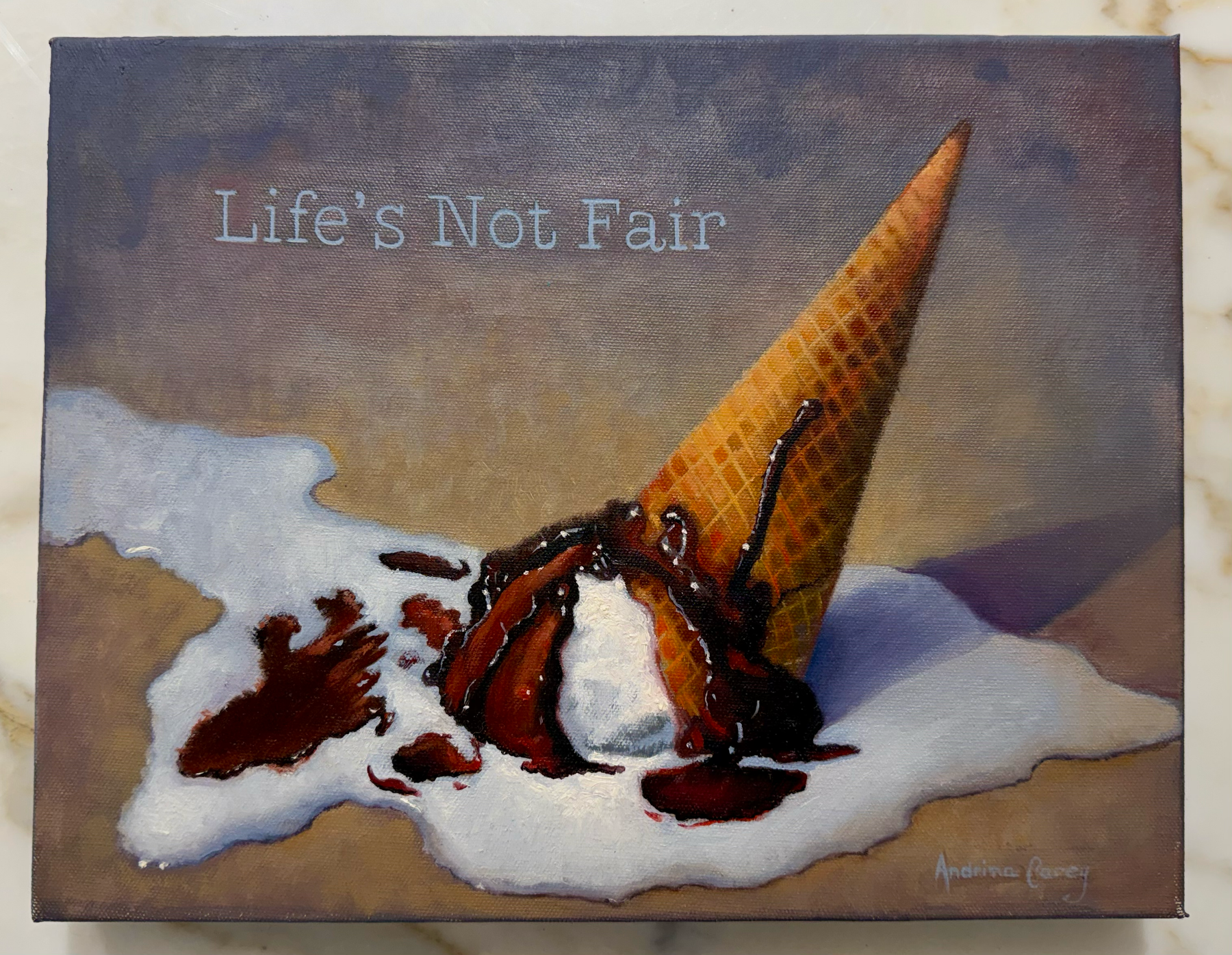 Contemporary realism oil painting featuring a fallen ice cream cone mid-melt, paired with the phrase Life’s Not Fair. Equal parts wit and realism, the piece offers a subtle commentary on disappointment, acceptance, and the humor found in everyday moments.
