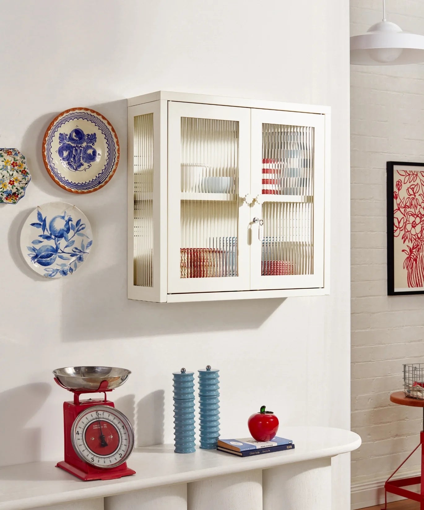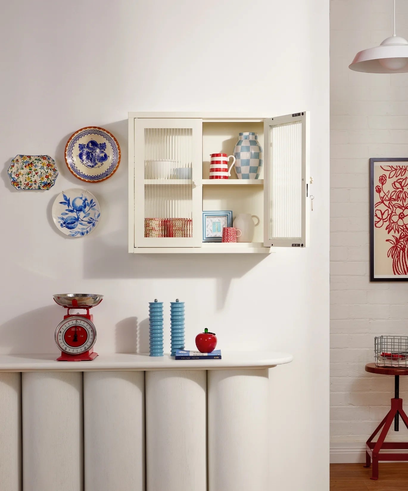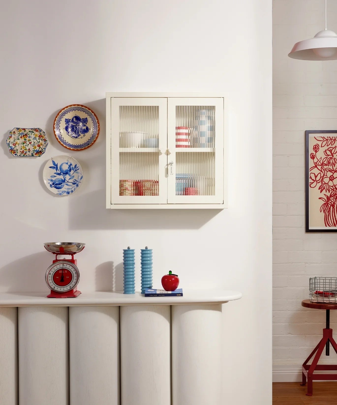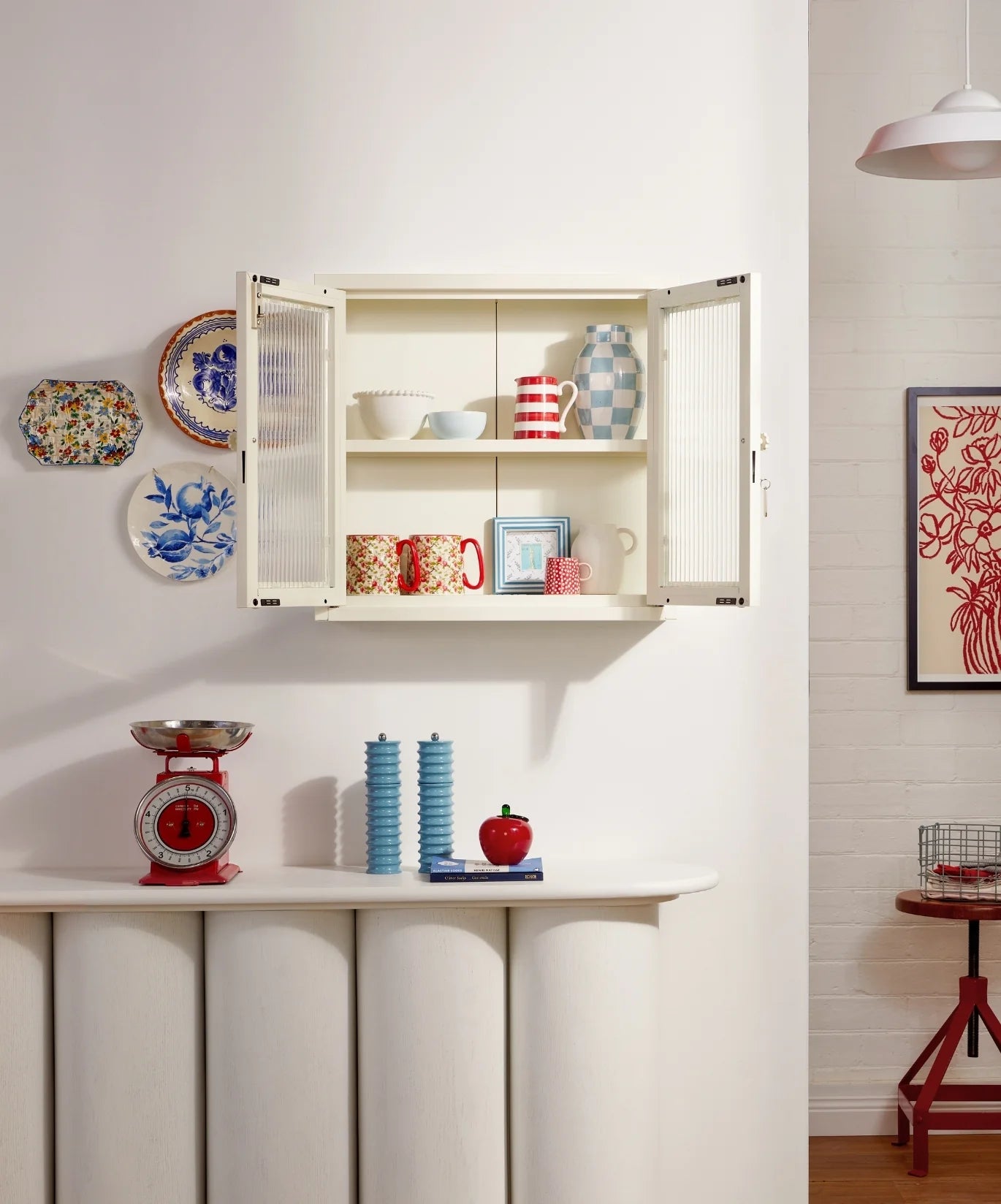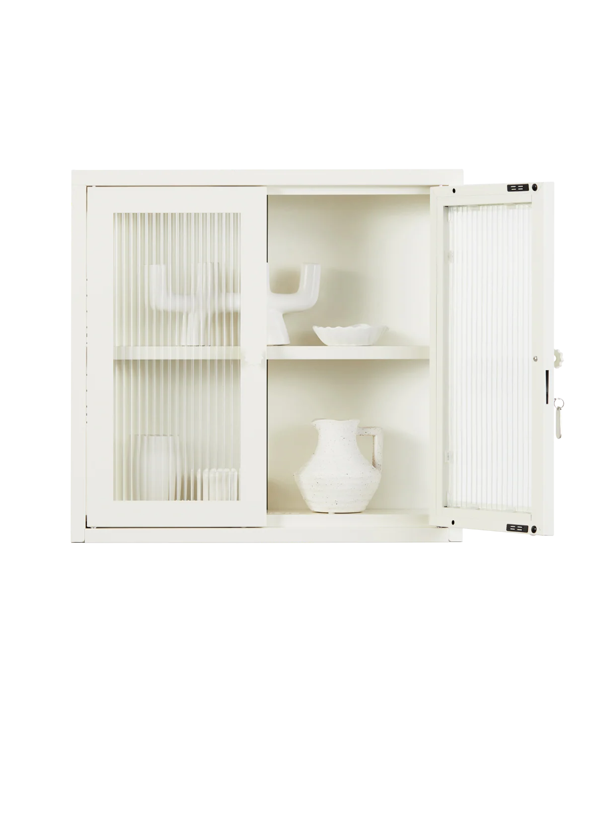 Petite and purposeful, The Kit is your vintage medicine cabinet reimagined! Wall-mounted and a little retro, she's ready to house everything from your keys to your serums to your teacup collection (cute!) With medallion handles and a custom enamel keyring, she's little and lovely and very, very useful. An adjustable shelf, lockable doors and fluted glass panels set in a metal frame. Medallion handles, a lock, a custom enamel keyring and Mustard logo.
