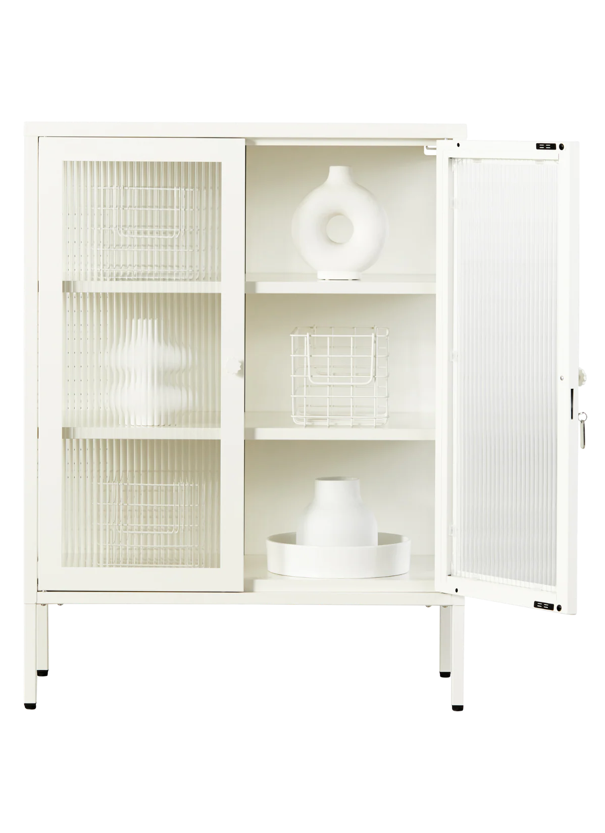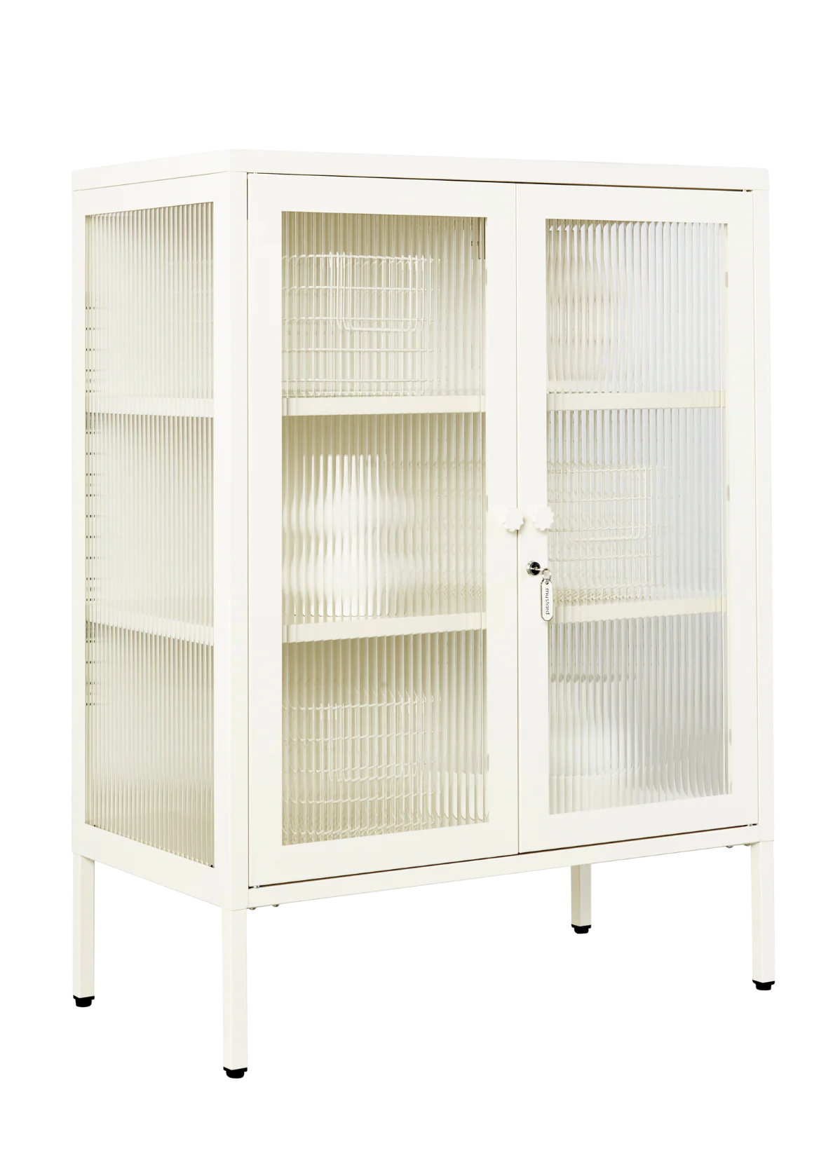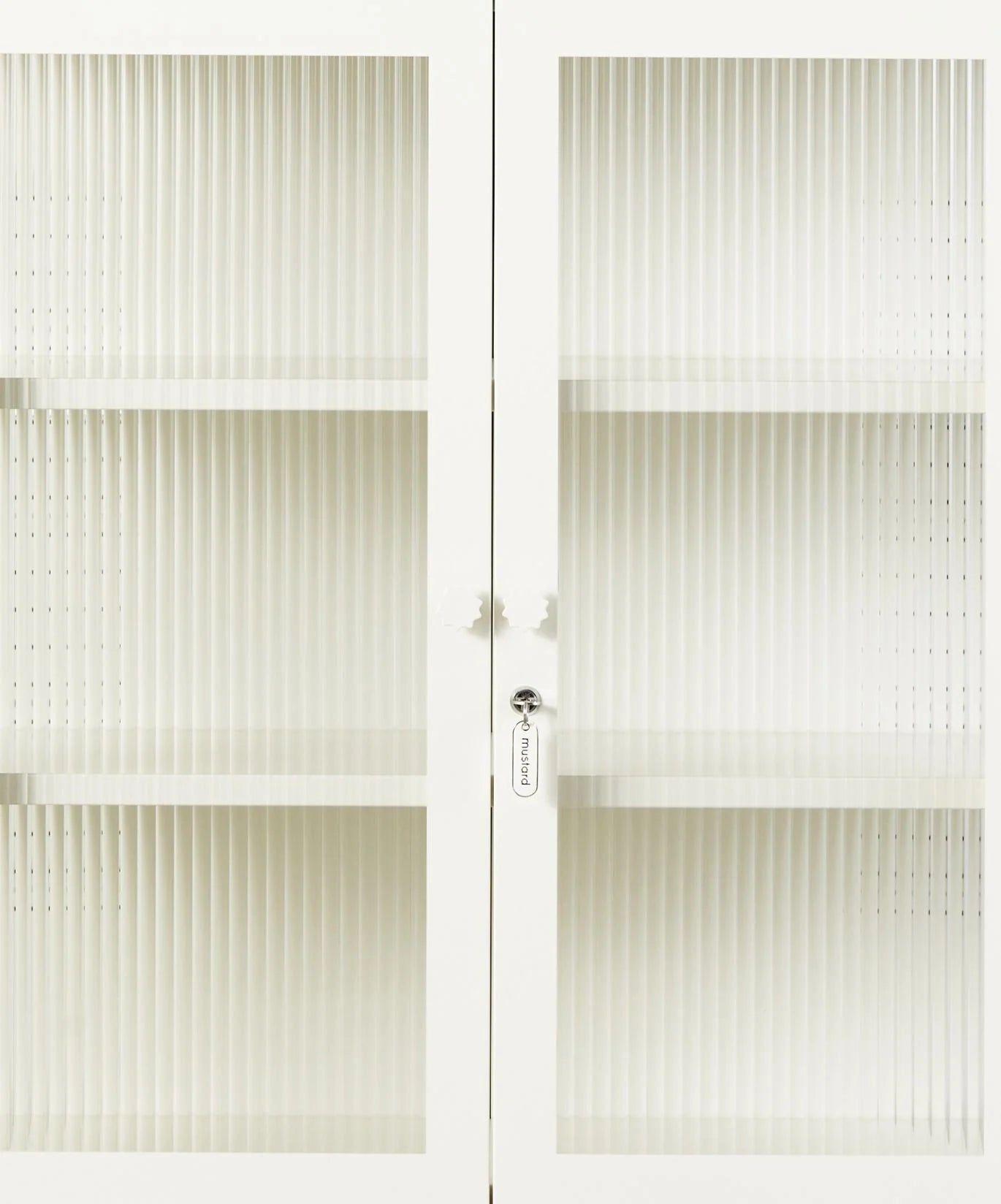 You can have nice things (and see them too!) When your favourite pieces are too beautiful to be hidden away, The Mixer is here to put them on display. She makes the perfect drinks cabinet, kitchen buffet or sideboard, with fluted glass to leave a little to the imagination. Medallion handles, a custom enamel keyring and adjustable feet make her the perfect mix of pretty and practical. Two adjustable shelves, lockable doors and fluted glass panels set in a metal frame. Medallion handles, a lock, a custom enamel keyring, Mustard logo and adjustable feet.