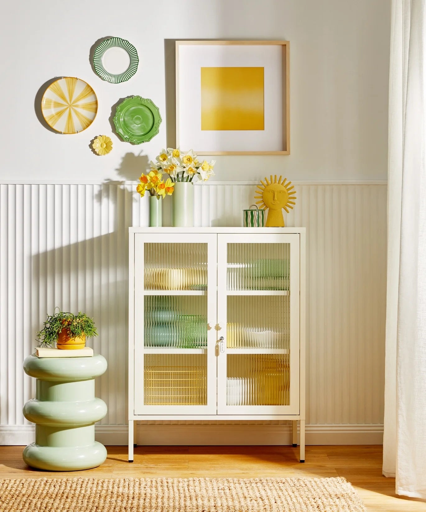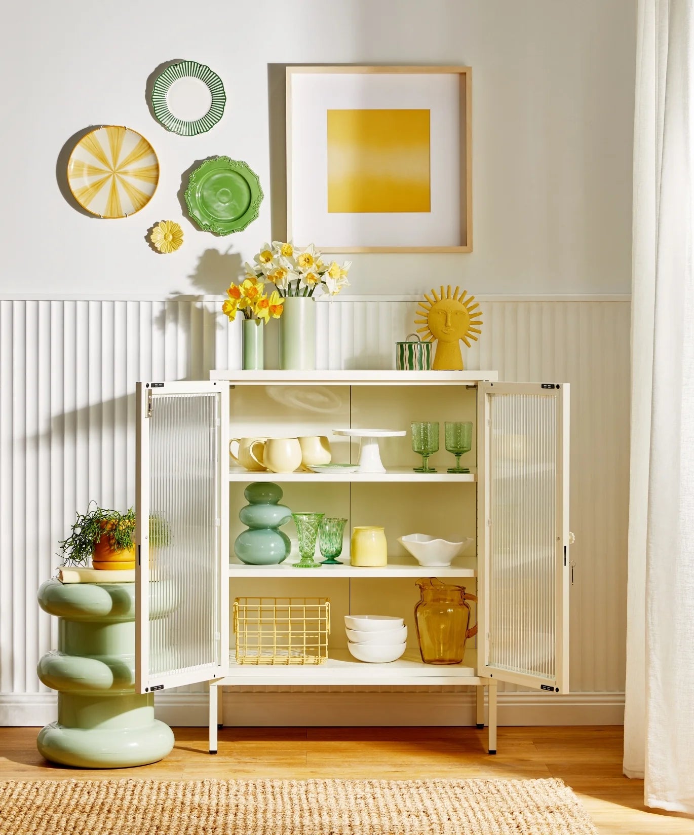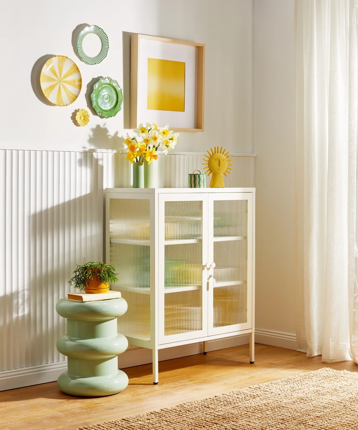 You can have nice things (and see them too!) When your favourite pieces are too beautiful to be hidden away, The Mixer is here to put them on display. She makes the perfect drinks cabinet, kitchen buffet or sideboard, with fluted glass to leave a little to the imagination. Medallion handles, a custom enamel keyring and adjustable feet make her the perfect mix of pretty and practical. Two adjustable shelves, lockable doors and fluted glass panels set in a metal frame. Medallion handles, a lock, a custom enamel keyring, Mustard logo and adjustable feet.