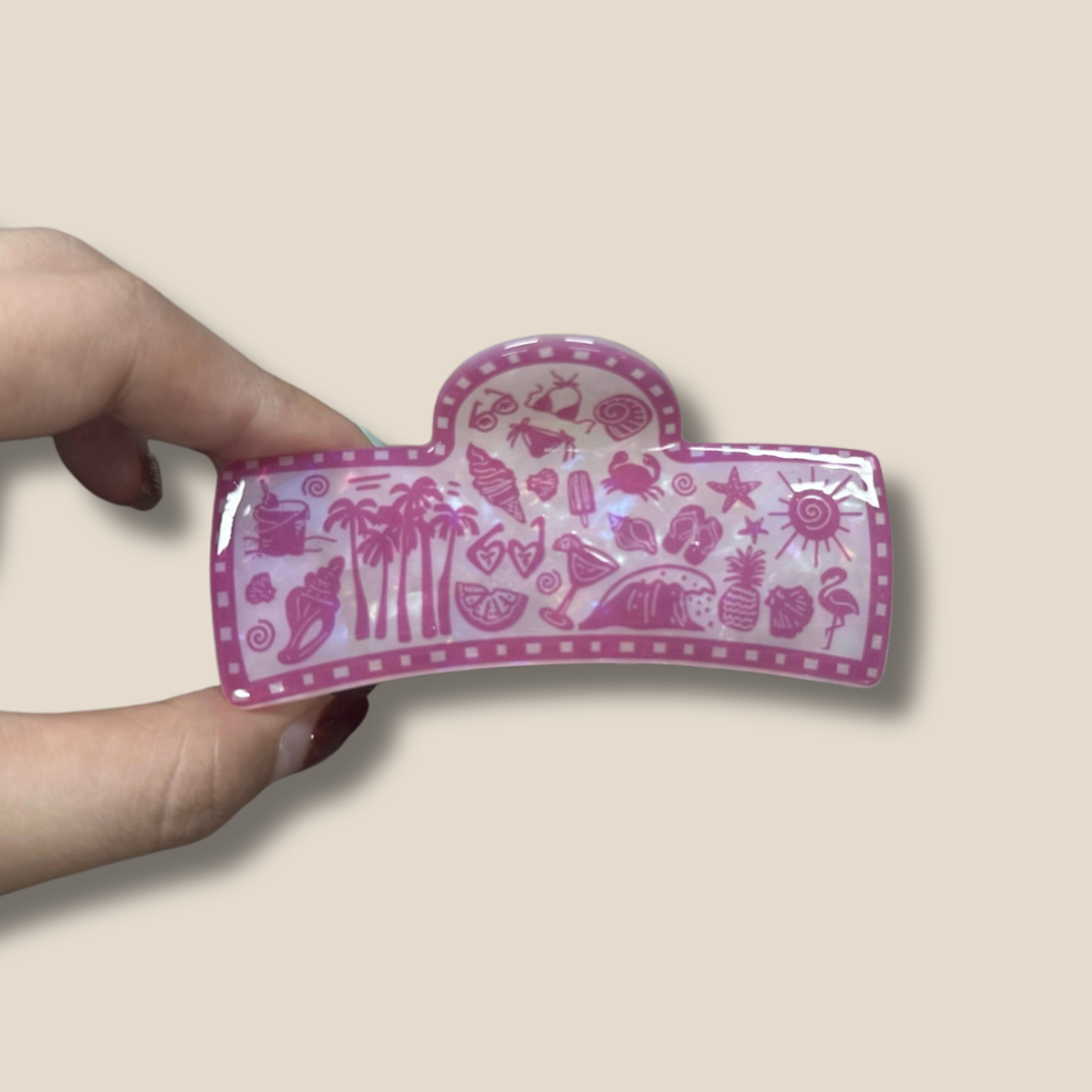 A beach day in a hair claw. This hair claw is made for sun-drenched afternoons, salty hair, and carefree summer nights. Whether you're strolling the boardwalk or dancing under neon lights, it’s the perfect pop of color for any adventure. Hot pink details with a pearlescent background. Lightweight and durable, it’s made for effortless styling.
